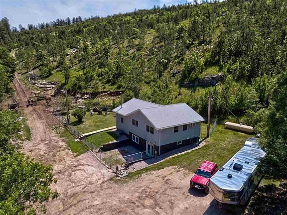 This modest, secluded home is 1784 sf, 1 bed/1 bath sits in the corner of 29.75 acres that has NO covenants off the gorgeous Crook City Road south of Whitewood. Main floor is open concept kitchen, dining, living room with sitting area with wood burning stove and wet bar. Kitchen cabinets are soft close hickory. Basement is the master suite with large walk-in closet with washer/dryer. Bathroom is off master bedroom. Walk-out master bedroom. Finishing the master suite ambiance is a gas fireplace. Brand new flooring has been installed in master suite. There is tons of storage in hidden crawl space along with 2 storage sheds. Apple trees, tons of oak trees, pine, spruce, aspen & birch along with turkeys, deer and other wildlife abound. A daily walk up to the top of the acreage will get you in shape in no time! Up top are million dollars views that you can enjoy from the dry sleeper cabin. Views of Crow Peak, Spearfish Mt, Lookout Mt, and Bear Butte as well as all the way to Whitewood.