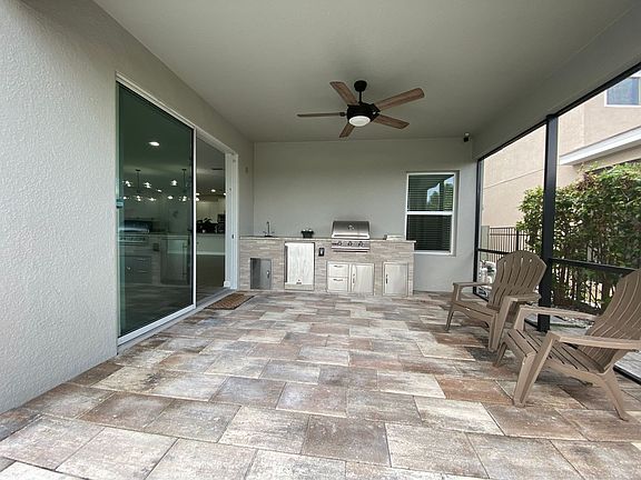 The main living area showcases an open-concept design filled with natural light, seamlessly connecting the modern kitchen, dining area, and spacious living room. Step outside to your screened-in pool lanai with a summer kitchen, perfect for outdoor entertaining and relaxing year-round.