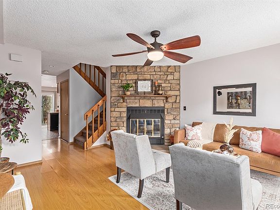 Come check out this charming 2-bedroom 3-bath Townhouse, with 2 reserved parking spaces, in The Peachwood neighborhood! The bright and cheerful floor plan spreads natural light throughout. Ceiling fans in each room help circulate air during any season. Enjoy cold and snowy nights next to the large fireplace. The open kitchen boasts a breakfast bar, pantry and plenty of prep space. A large sliding glass door leads to a private deck and grassy yard, great for entertaining and summer barbeques. The upstairs features vaulted ceilings and two spacious primary bedrooms, each with large closet and attached ensuite. There's plenty of storage throughout the home with additional closets and a large crawlspace. Don't miss the 5 star energy rated Champion Windows throughout installed in fall 21'. Located in the highly sought-after Cherry Creek School District, close to Aurora medical center, several parks, & the High Line Canal trail. Don't miss out on this one!