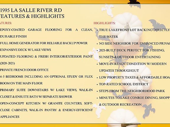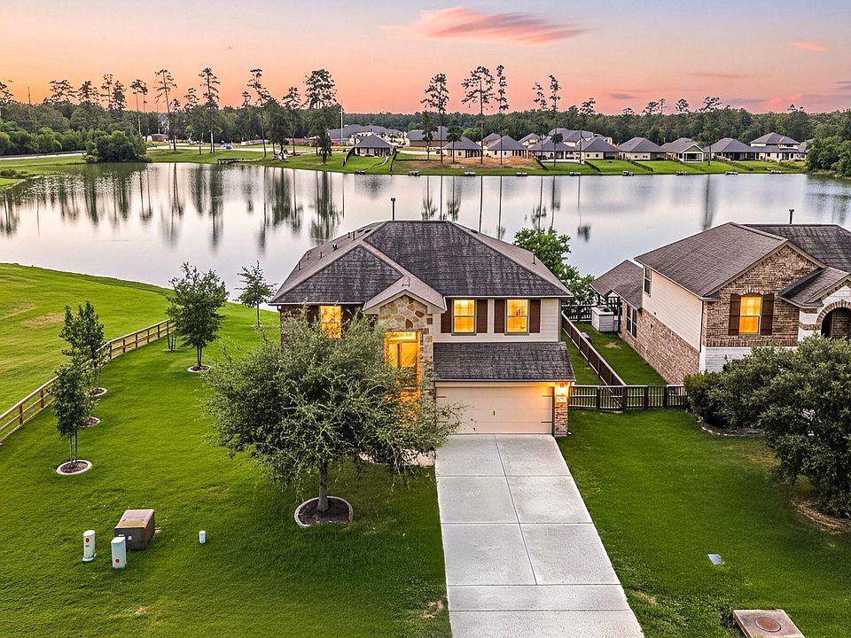 Waterfront tranquility meets everyday comfort in this stunning move-in-ready home backing directly to the lake! Enjoy peaceful privacy w/ no side neighbor, a lush fenced yard & a full home generator for worry-free living. Spend evenings on your 2021-built deck overlooking the stocked lake, perfect for fishing, relaxing sunsets & weekend entertaining. Inside, the open-concept layout shines w/ updated flooring, fresh interior & exterior paint (2020–2021), energy-efficient appliances, granite counters, soft-close cabinetry & walk-in pantry. The primary suite down offers serene water views, a spacious walk-in closet & spa-style bath w/ separate shower. Upstairs features 3 roomy bedrooms, a full bath & a large game room—plus a flexible 5th bed or study on the main level. Additional perks include an epoxy-coated garage, low taxes, affordable HOA & top-rated schools. Steps from the neighborhood park & just minutes to Lake Conroe dining, shopping & outdoor adventures. Dont miss out!!