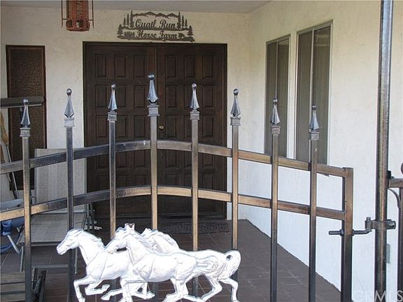 This spanish style home is at the top of a hill with 360 degree views of Reche Canyon, the San Bernardino Mountains and Mt. Baldy. The 2438 square foot home has an extra large living room with fireplace and floor to ceiling windows, a spacious country kitchen with extensive cabinets and pantry space. A formal dining room looks over the Reche Canyon Valley and front porch. The two car garage opens to the kitchen, and off the entry is the laundry area and a full bathroom. Upstairs are three generous bedrooms, a closed in patio with views and a full bath. Going down the paved road to the valley behind the house is a 24' x 36' barn with a finished room. The stable is 24' x 24' with a fenced arena. There are beautiful hills, valleys and grassy knolls to enjoy by horseback, hiking or dirt biking.