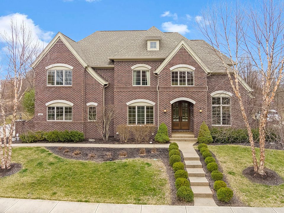 Beautiful, French-inspired, Rex Brown built home available in desirable Saddlebrook at Shelborne. The front approach provides a grand and welcoming entrance with double, arched mahogany front doors setting the tone for the luxury finishes in the rest of the home. Main floor boasts private office, dining room, open chefs kitchen, great room and guest powder room. The custom finishes include 11 ft ceilings, 5" hardwood floor, solid granite countertops and stunning beamed ceiling in the great room. Arched columns elevate the space but keep an open feel perfect for entertaining. The kitchen is a central point of the home flooded with natural lighting, custom cabinetry, double ovens as well as a separate walk-in pantry. Off the kitchen is a family eating area surrounded by windows and beautiful private views of West Park. The fully finished lower level offers a lot of flexible space while still maintaining the elevated feel of the main level featuring 7 ft ceilings. Home theater space is open to a custom finished wet bar. The private second level of the home holds the primary suite, three additional generously sized bedrooms, each with designated bathrooms, as well as a nicely finished laundry room with utility sink. The primary suite features an impressive barrel ceiling that is mirrored in the master bath. The attached dressing room is finished with custom clothing storage and a granite top island. Three car spaces divided into a 1 car and 2 car garage bays. The side entry into the home provides the perfect landing spot with built in lockers and dedicated coat closet. The outside features include a covered outdoor space and private back yard with tree-lined perimeter. There is easy access to the West Park walking path. The home directly backs to the wooded area of West Park which offers secured privacy as well as plenty of open spaces, water features and nature walking trails.