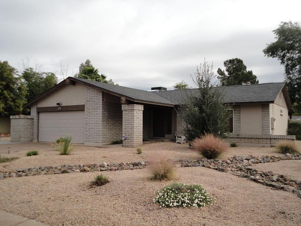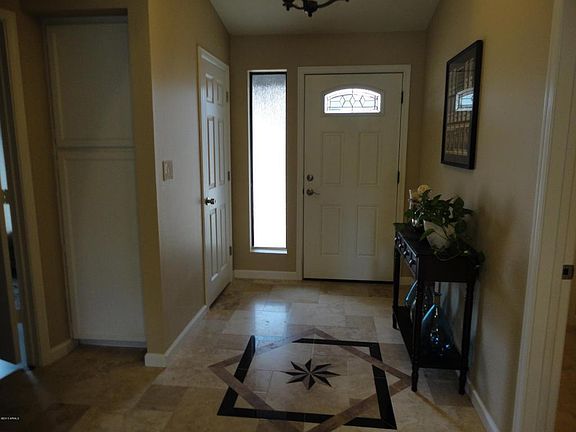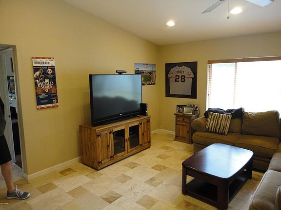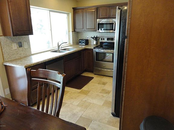 Updated in 2011, this home has travertine tile floors in the entry, kitchen, living room and bathrooms, and faux-wood flooring in the bedrooms. The kitchen and bathrooms have granite slab countertops, stainless steal appliances, and new cabinets. There are new ceiling fans in each bedroom and the living room, as well as new AC and new roof. Desert landscaping in front and combination of desert and grass in the back yard. New paint throughout.