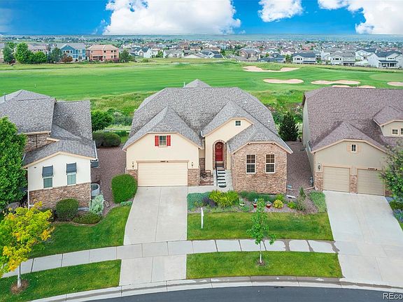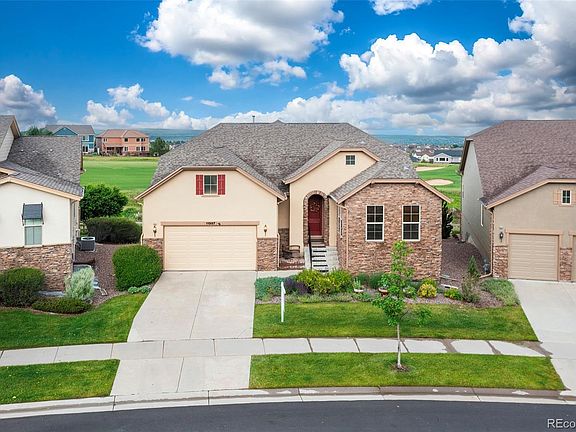 VIEWS, VIEWS, VIEWS...breathtaking views. As soon as you turn onto the street you are mesmerized by the well manicured lawns and meticulously maintained homes. This nook in the Villages of Parker is special! Upon arrival at the home you are immediately drawn inside. Stepping through the front door a spacious foyer greets you with lovely hardwood floors. Moving into the family room you cannot take your eyes off the stunning view visible all along the rear of the home. The golf course and mountains are awe inspiring. Family room boasts vaulted ceilings with dramatic wood beams. The two sided gas fireplace connects the family room to the spacious dining room. Let's talk about this kitchen....beautiful, large island featuring seating for at least 5. The space includes a coffee bar, gas cooktop, double ovens and more. The granite is pretty spectacular and accents the abundant cabinet space nicely. The spacious primary bedroom is nestled behind the family room and is the perfect place to retreat after a long day. The 5 piece ensuite is fabulous, as is the large walk-closet. But...how about the closet connects to the large laundry room that boasts natural light, storage, and a utility sink!? Also on the main floor you will find a large office featuring glass doors, a second bedroom and full bath with dual sinks. Ready for some fun?? Come down to the basement where the games begin. Large gathering space is perfect for movie night. The game room sits behind the family room & provides access to the back yard where you can find those AMAZING views, a covered patio, swing AND a hot tub. The basement also includes a bar complete with wine fridge, wine storage racks, eat-in area, & refrigerator. Two additional bedrooms & another full bath are also in the basement. Want more?? The gym is spacious as is the storage area! This home truly has it all. Oh wait...the lawn is maintained by the HOA and the snow will magically disappear as that is part of the HOA too!