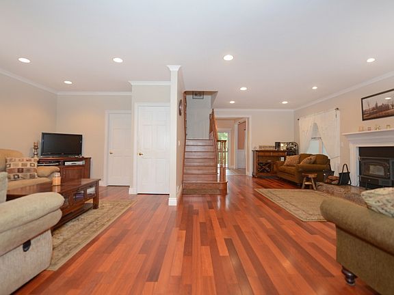 Relax and unwind in this private retreat! Large beautifully tiled foyer. Open entry level and main floor flows with stunning Rosewood floors, connecting the living room and family room with a woodburning fireplace. Kitchen w/ granite countertops and breakfast bar. Formal dining room. Slider opens to 2-tier oversized deck area. Your backyard is a beautiful view of protected parkland. The deck leads down to paver patio area complete with koi pond. From the patio, you enter into the house through the partially finished basement complete with a half bath. Hardwood floors carry up to the 2nd floor with 2 generous sized bedrooms and large sun filled master suite with cathedral ceiling. Master bath features double vanity, jetted tub and stall shower. Paver driveway and large storage shed, 1 car detached garage