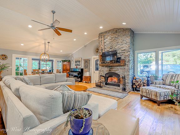 Stone wood-burning fireplaceCompost systemWarm open-concept homeWalking trails