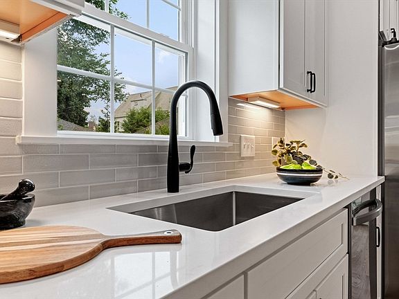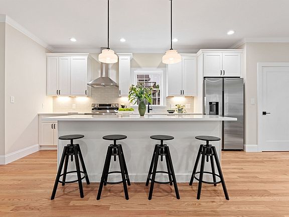 This energy efficient home showcases the latest in design trends, featuring sleek countertops, white cabinetry, stainless steel appliances, black accents and fixtures, recessed lighting, and hardwood floors with a natural finish. Enter from exclusive use front porch. The open-concept kitchen, living, and dining area is flooded with natural light, making it perfect for entertaining. The second floor includes two spacious bedrooms with ample closet space, a full family bathroom, and a laundry area with built-in cabinetry. The third-floor primary suite is a luxurious retreat, boasting cathedral ceilings, an ensuite bathroom with a double vanity and walk-in shower, generous closet space, and a private balcony. The home also offers five zones of heating and cooling, and a finished basement with versatile potential. The yard is shared, and there are two off-street parking spaces on a new pervious pavement driveway. Don't miss the opportunity to make this exceptional townhouse your new home.