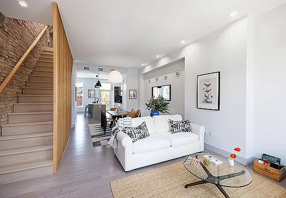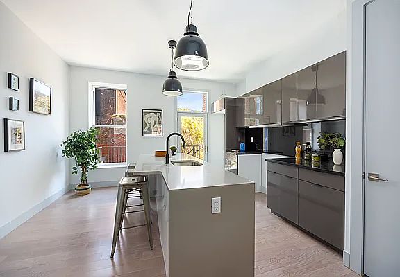 12 Agate Ct, located in a landmark block. This gut renovated unique property is carefully designed and was finished with extra care. This 3.5 floors single family could be used as a mother in law suite as well. Through the brow stone stairs as you look at the building you are welcomed by custom made wooden original doors. Through the door as you enter the parlor lever you are welcomed by an open living and dining area, featured with stained hardwood floors. Kitchen is located at the rear of the building, leading to a 7 ft wide terrace and beautifully maintained backyard. Kitchen featured Carrera countertops and white and black kitchen cabinets. For extra convenience, parlor level is also featured with a half bathroom finished with large hexagon grey tiles. Parlor level also featured an extra large window on both sides of the house for extra sunlight. Through the parlor level wooden stairs with tall floor to ceiling white oak railings and exposed brick leads to the second level. Second floor is divided into a master bedroom and guest room. Master bedroom located at the front of the building with double closet, en suite bathroom, extra windows looking at landmarked row houses. Master bathroom features with stand up shower, tub and large size vanity. Second floor also features with guest bathroom and washer and dryer hookups. Second bedroom is located at the rear of the building, featuring double windows and closets. Wooden stairs also lead to the top floor, which could either be used as an extra guest bedroom or home office, leading to a roof through a glass door, top floor also featured with half bathroom and closet spaces. Parlor level also leads to garden level which is currently used as an open space and a bedroom with full bathroom. For extra convenience the garden level has its separate entrance through the front and could be used as a separate apartment. Garden level also leads to the backyard through the door in the rear. The living area of the garden level staircase leads to the finished basement, which could be used as storage, or exercise room. Property is located in the heart of Bedford Stuyvesant bordering Crown Heights. Only a couple of blocks from C train at Kingston Throop ave stop and LIRR at Atlantic ave. This part of Bedstuy is popular for their restaurants, bars, cafes and supermarkets.