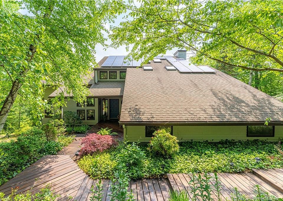 Captivating home with solar power and an incredible primary suite. Nestled on a 1.66-acre cul-de-sac lot on Applewood Common, this 4BR/3.5BA home offers classic Northeastern charm with a stunning backdrop of mature trees, gorgeous contemporary architecture, and lush landscaping. Drenched in natural sunlight through oversized windows the interior features hardwood floors, vaulted ceilings and an open floorplan linking the formal dining area to a large living room with a stone clad fireplace. The thoughtfully designed gourmet kitchen includes premium KitchenAid stainless-steel appliances, granite counters and contemporary wood cabinets. A French door refrigerator, center island, glass tile backsplash and breakfast area with wood burning stove creates a warm focus to this home. Restful days may be enjoyed in the sizeable primary bedroom with balcony access, a large walk-in closet, and an expansive en suite with soaking tub, dual sinks, skylights, and separate shower. A versatile guest suite with a private entrance is found on the lower level and contains a full kitchen with Bosch appliances, a spacious living area, European styled bathroom, and double bedroom. Brimming with entertainment-value, the outdoor space has multiple decks, a sprawling greenspace, peaceful nature views, and a luxurious hot tub which make this property feel like your own personal spa retreat! Other features: 2-car garage, laundry area, quick commuting, 10-minutes to area beaches, shops, dining and more!