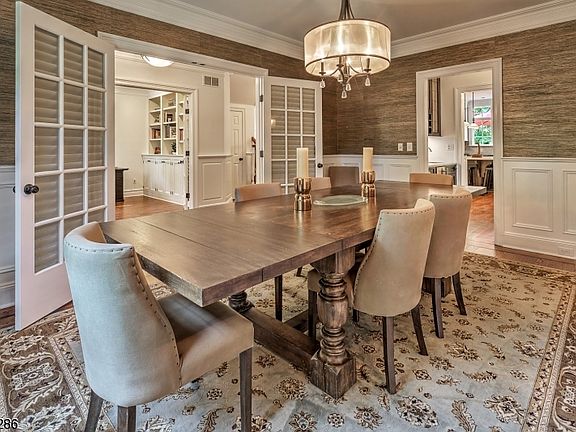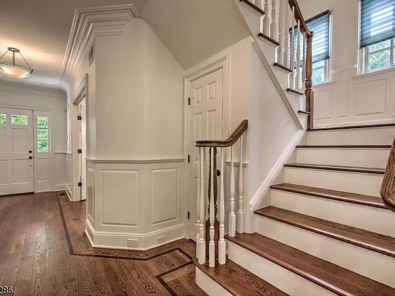 This impressive Colonial seamlessly blends luxurious architectural finishes with sought-after sustainability. Built by a local master builder in 2011, its numerous custom features have been extended by the current owners to include an efficient solar power system that will continue to benefit future owners and the environment. This home sits prominently in the Spring Brook neighborhood, one of several newer homes on the street. A bluestone walkway leads to a classically designed front entry. The front hall features raised panel wainscoting, hardwood floors and nine-foot ceilings that flow continuously throughout the main floor. Double French doors flank either side of the hallway, providing entry to a formal dining room and to the living room which has been repurposed as a home office. Custom millwork in these rooms includes wainscoting, crown moldings and floor-to-ceiling cabinetry and shelves. Large transom-topped windows in the kitchen and breakfast room invite natural light and views of the rear yard, with easy access to a bluestone patio. Marble and stone finishes accent custom cabinetry in the kitchen, some with lighted interiors and leaded glass doors, and the expansive center island makes entertaining effortless. A professional six-burner gas range with exhaust hood and a Sub-Zero refrigerator, Miele dishwasher and walk-in pantry will delight any chef. The adjacent butler's pantry offers a wet bar, a beverage refrigerator and custom cabinetry with a marble backsplash. Just off the kitchen in the family room, a coffered ceiling sets the tone for this sophisticated space, perfect for entertaining or relaxing in front of the gas log fireplace surrounded by a custom wood mantle. French doors afford an indoor-outdoor flow to the patio and yard. Nearby, a rear hallway provides a casual entry point and staircases to the second floor and lower level, which offer additional finished rooms for a mix of activities. A private bedroom space with a full egress window and full tiled bathroom create a comfortable guest area on the lower level. Upstairs, the primary bedroom is well located to afford privacy and a peaceful retreat at the end of the day. The vaulted ceiling and abundant windows enhance this oversized room, and an L-shaped walk-in closet has built-in shelves and drawers plus ample hanging space. The luxurious tile and granite en suite bath has a custom double sink vanity, slipper-style soaking tub, frameless glass shower and a separate water closet with a self-cleaning commode. Two additional bedrooms share an en suite bath, and another bedroom accesses a full hall bath. Hardwood floors, crown moldings and custom cabinetry continue on the second level. A fully equipped laundry room with a sink and cabinetry completes the second floor. The walk-up attic is fully floored for storage and provides an opportunity to create future finished living spaces. This established neighborhood offers quiet residential streets near golf courses, parks and downtown Morristown as well as highly-rated public and private schools, all within commuting distance of Manhattan via Midtown Direct trains.