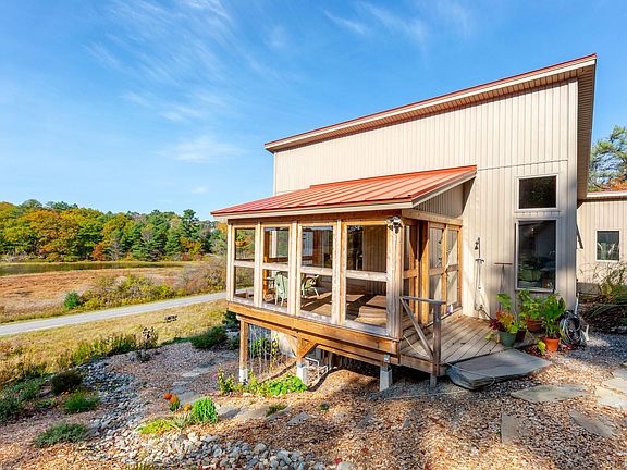One of a kind, custom-designed Contemporary privately situated on almost 4 acres of bucolic fields and woods. Spectacular westerly views over a salt water pond - bird life and sunsets abound! Open concept kitchen/dining/living room with Master suite, laundry and mudroom make up the main floor. Two large rooms (easily accommodating guests) are on the lower level, along with ample storage space. Screened porch with hot tub overlooking the vista, a 2-car detached garage and even an outdoor shower complete this charming retreat. High quality craftsmanship throughout. Abuts conservation land and trails. Minutes to Bath, Brunswick and beaches.