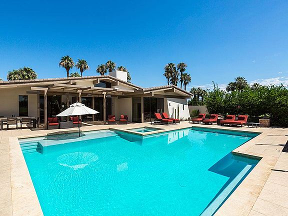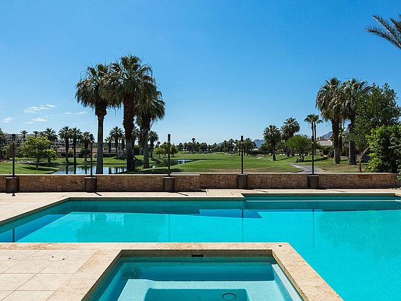 Contemporary custom luxury is the only way to describe this fantastic estate that provides incredible entertaining spaces both inside and out. This highly sought after golf course home is located in the pristine Marriott Desert Springs Estates community and overlooks the famous Palm Course. This south-east facing estate is situated on a half acre lot, with magnificent mountain and golf course views. The beautiful saltwater pool and spa are completed by the large tanning shelf. Outdoor kitchen has two built-in BBQs, outdoor fridge, and sink. Inside, vaulted wood ceilings showcase the spacious great room with a floor to ceiling stone stacked fireplace. The travertine floors carry you from room to room. Kitchen has stainless steel appliances and caesar stone countertops. Formal dining room, wet bar, and second sitting area. Spacious master with fireplace, retractable curtains, and patio access. All four bedrooms are ensuite.