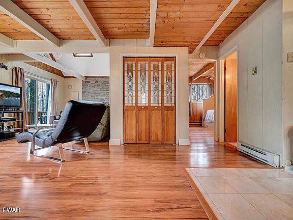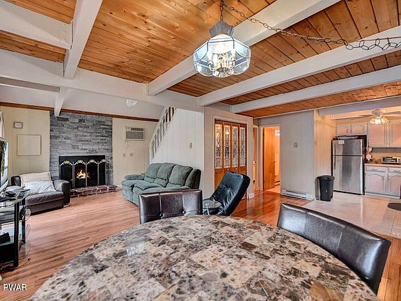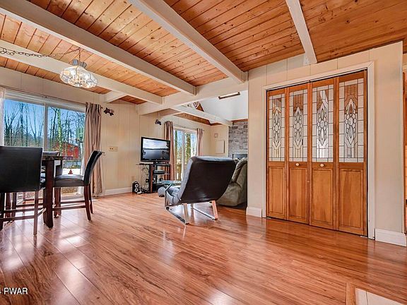 Chalet home for Sale in The Hideout, an amenity filled community in The Northern Poconos, just two hours from the NY, NJ and Philadelphia Areas. Located on an oversized lot of nearly an acre, strategically positioned at the center of a sought-after cul-de-sac renowned for its privacy and absence of through traffic. This vinyl sided residence welcomes you with an open floor plan, complemented by a striking fireplace that adds both warmth and character. Boasting two bedrooms and two well-appointed bathrooms, the home provides comfort and functionality. The spacious loft, offering access to an exterior balcony, can seamlessly transform into a third sleeping area or a versatile multipurpose space. A delightful enclosed sunroom further enhances the property, providing a serene retreat for relaxation. With its desirable features and prime location, this home stands as a perfect blend of style and convenience for the discerning homeowner.