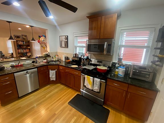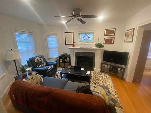 First floor of a three decker w/ separate entrance. It is a 2 BR/@2 BA w/gas fireplace in the LR. Front and rear porches, shared back yard w. patio, outdoor furniture and plantings. Assigned storage area in basement. No parking but it is a permit only parking street and tenants can get stickers and visitor parking permits. 6/1 Move date