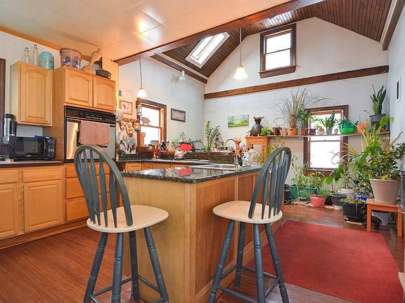 This spacious 4-bedroom, 2-bathroom home is ready for its new owner! You'll appreciate the beautifully updated kitchen featuring hardwood floors, granite countertops, and a natural wood breakfast bar. The wooden cathedral ceiling, complete with a skylight, creates a bright and inviting atmosphere. The first-floor bedroom/office provides ample space for those who work from home. The main level also includes a formal dining room, a cozy living room, a full bathroom, and a main entry with a custom tile floor. Upstairs, you'll find 3 additional bedrooms and another full bathroom, along with a partially finished walk-up attic offering two bonus rooms that are in need of some TLC. The basement is partially finished and includes a wood stove, perfect for extra warmth and comfort. Enjoy the changing seasons from your porch or unwind in the large, private backyard. The oversized 2-car garage has its own electric meter and furnace, making it an ideal space for a workshop or additional storage.