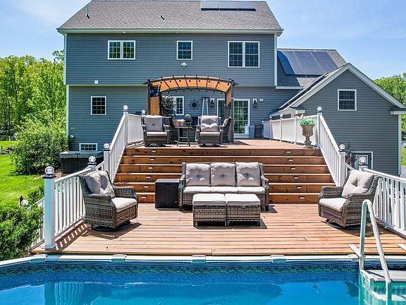 Fantastic opportunity to own this 7 year young custom colonial in the highly sought after Great Woods Estates. Situated on a corner lot this home features an open concept first floor with 9 foot ceilings and gleaming hardwood floors. The chefs kitchen was designed for entertaining with an oversized quartzite two tiered island, wall oven with plenty of cabinets and large drawers for storage. The large family room boasts cathedral ceilings with floor to ceiling stone surrounding the gas log fireplace. Four bedrooms upstairs with large master, including a custom tile shower, double vanity and corner soaking tub. Tankless water heater installed in 2022. Outside features a large, two tiered custom deck overlooking the private, wooded backyard, pool and spa!! Trails lead directly to Long Pond and the Pelham Beach. Solar panels have just been installed and provide a full 100% offset to completely eliminate your electric bill. Schedule your private showing today!!!