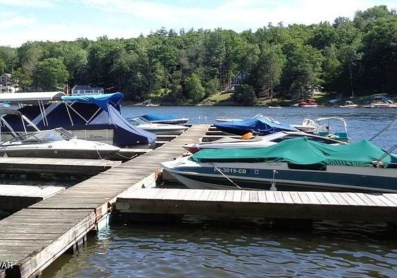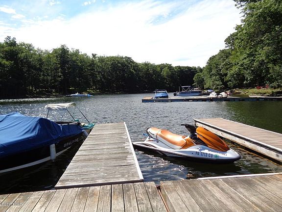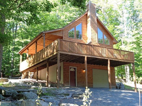 LOG CHALET with BOAT SLIP on motor boating Lake Wallenpaupack. Private corner wooded lot with 2 driveways for upper and lower access. Lots of parking. Immaculate, move in ready, year round enjoyment. Open floor plan, fireplace, central air, covered porch, large deck and garage. Short walk or RIDE YOUR 4 WHEELER to boat slip. Commutable distance to major metro areas.