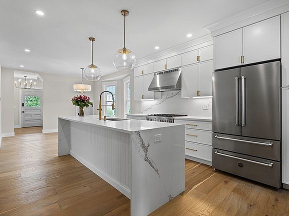 HUGE PRICE REDUCTION! Step into this spectacular 4 BR/2.5 bath New England colonial fully renovated where classic charm meets modern luxury. This stunning home is meticulously updated to offer contemporary living while preserving its historic character. Open concept with 9 1/2 foot ceilings and wideplank white oak throughout. A chef's dream kitchen offers all Bertazzoni appliances including microwave drawer, quartz waterfall island, and convenient pantry area with decorative open shelving. Cozy family room with tiled fireplace that's wired and ready for your huge flatscreen. French doors open to a private office/living room with crown mouldings and usb/usc outlets for your convenience. Four oversized bedrooms including a private master suite with luxurious porcelain tiled ensuite bath and enormous walk in closet. New energy efficient HVAC with ERV system, black Harvey windows, Navien tankless water heater, Azek railings, Kohler fixtures, gas heat, 2 car detached garage.