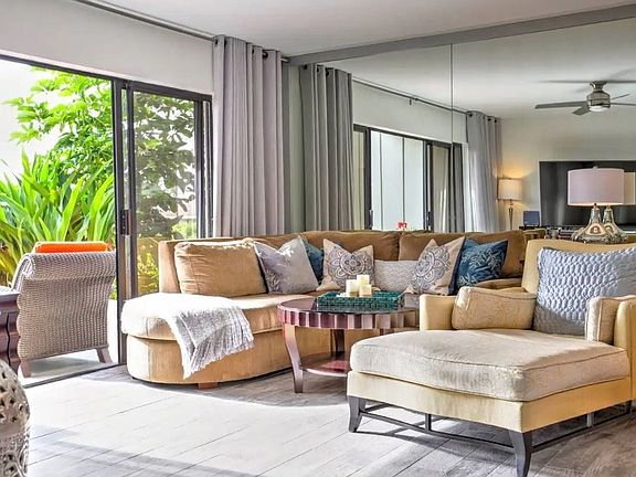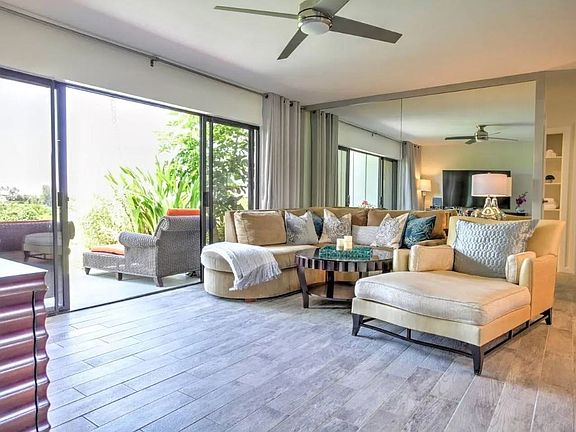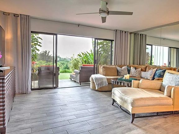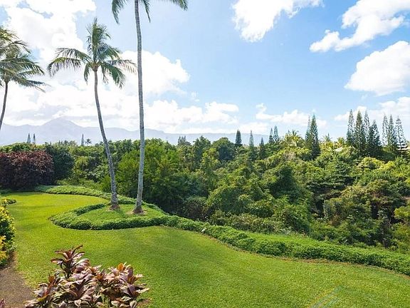 Panoramic Hanalei mountain and tropical greenbelt views from Alii Kai #12C. One of the nicest remodels in the project, fully renovated top to bottom! Gorgeous, low maintenance, porcelain "wood-look" tile flooring throughout; custom cabinets and vanities; granite counters; stainless steel appliances; and quality décor. Two spacious ensuite bedrooms both with beautifully upgraded baths. Offered fully furnished and turn-key. Ground floor with no stairs to climb. Step off your lanai right onto the grass further explore the views. Short stroll to beach trails. Enjoy the sounds of big surf in the winter right from the unit!