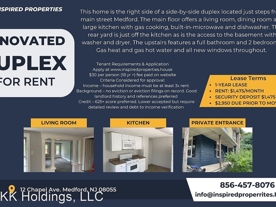This is a 2 bedroom, 1.0 bathroom, townhome home. This home is located at 12 Chapel Ave, Medford, NJ 08055.