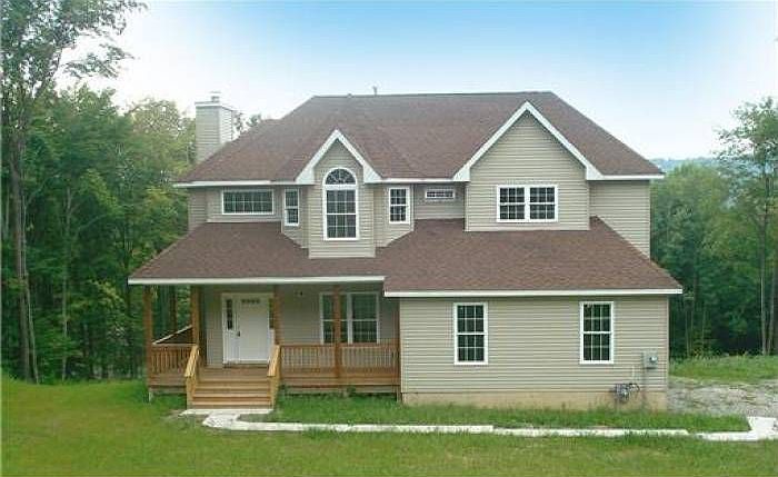 Spacious Colonial in the Minisink School District. Home features a wrap around porch and intricate roof lines. Nestled on a cul-de-sac this homesite has beautiful mountain views. Two-story open foyer with hardwood flooring and arched entryways leads to a formal living room with hardwood flooring, formal dining room and family room with wood-burning fireplace and marble surround. Eat-in-kitchen includes granite countertops and an angled breakfast bay. Master bedroom suite includes a tray ceiling, large walk-in-closet, separate tiled shower and whirlpool tub. Spacious secondary bedrooms with large closets. Bedroom number 2 has an angled tray ceiling. Walk-out basement with egress windows. ALL THIS FOR ONLY $299,900. DEFINITELY WORTH SEEING! Don't forget to add this date and time to your appointment book. Open House, Sunday, August 21, 2011, 1-4 PM. Look Forward to Meeting You There!