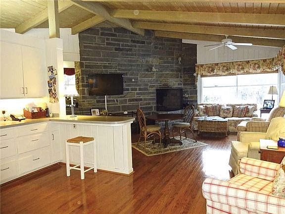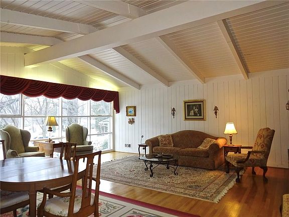 Very Chic Mid Century Modern Ranch with basement under the house. Stone and cedar siding. (Some exterior painting contracted for Spring. Very open interior with all wood slat cathedral ceilings. Harwood floors sparkle, and are under carpet in the bedrooms, Great room with wood burning fireplace and one in the Kitchen/ Family room too. Extensive landscape stone work in the front and back yard,Patio,Enclosed porch off the kitchen.Furnace Aug 2018, AC 2017 Rec Room 2018, Dishwasher 2018, Kitchen hardwood floor 2015, Porch windows 2009.Walk to Pittsford Village on new sidewalk. 1.5 Mile