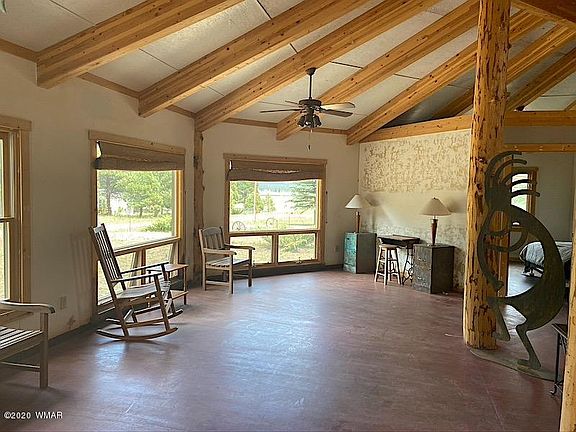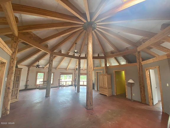 Fantastic Opportunity ...Unbelievable potential! This open beamed ''in the round'' ceiling is the centerpiece of the cabin. It's cozy openness offers a family the opportunity to be together or with privacy. All the rooms, including 3 bedrooms (1 master suite) come off that center area. This cabin has amazing potential and will require some ''fix-up'' to make it your own. There is a beautiful entry way and sitting area with large picture windows. Easy access via the Apache County maintained road. The cabin is on the Alpine water, sewer, and electric systems. Unfinished garage, beautiful lot, lush pines, and just minutes away from hiking trails in Bush Valley and the National Forest. Estate Owned Property being sold as is. You should take a look!