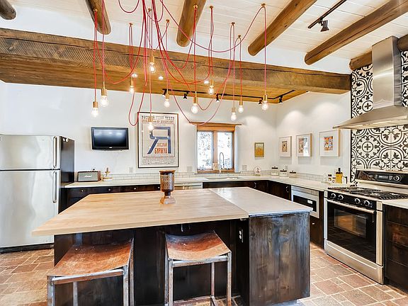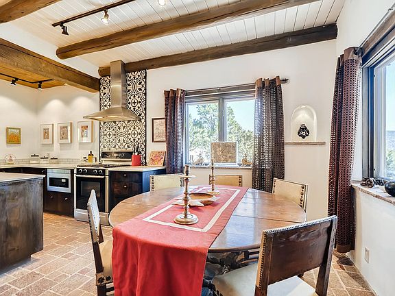 A peaceful place amid fruit trees and the dramatic terrain of Canoncito. Recent renovations have transformed this special property into a one-of-a-kind elegant countryside haven that is a delight for the senses and a salve for the soul. The interior spaces wrap around the exterior's generous covered portals and flowing water feature and give a feeling of seamless indoor/outdoor living. A generous hallway with floor-to-ceiling windows connects the kitchen/living area with two bedroom suites and a second dramatic living room with wood burning fireplace. At the far end of the home is the third privately situated bedroom suite with a separate patio. The interior finishes consist of a cohesive mix of old and new with plaster walls, rich woodwork, antique doors, stone floors, and modern details all mingling effortlessly to provide a luxuriously comfortable and organic retreat.