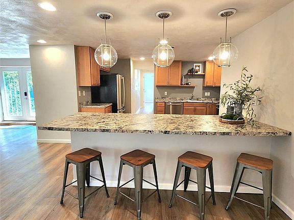 This gorgeous, newly renovated ranch home, nestled towards the back of Signal Hill, offers the perfect blend of nature and modern comfort. Step inside to discover a harmonious open concept design w/ vinyl plank flooring that flows seamlessly throughout the living space. Enjoy the vaulted ceilings in the living room, and a wood-burning stove provides both warmth and character. The kitchen features a large peninsula w/ bar seating, stainless steel appliances, and a double sink. The primary bedroom is spacious, w/ a generous picture window framing the scenic outdoors. The ensuite bathroom complete w/ a closet, walk-in shower, and a stunning vanity. A convenient laundry room with built-in cabinets is just down the hall. There are two additional bedrooms, and a stylish shared full bathroom. This home is a true gem, providing a blend of natural beauty and modern living. Don't miss your chance to experience the peaceful, wooded serenity of this unique hilltop retreat. Welcome home!