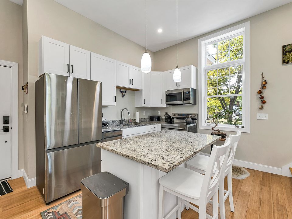 Welcome to a truly unique opportunity to own a piece of history reimagined for modern living. This remarkable former schoolhouse has been transformed into a collection of luxury condominiums, and this two-bedroom, one-and-a-half-bath unit is a standout. Spanning the second and third floors, the residence blends historic character with contemporary design, offering soaring 11-foot ceilings and oversized new windows that flood the space with natural light. The kitchen is a showpiece with white shaker cabinets, granite countertops, a center island, and an appliance package ready to inspire your inner chef. Bamboo flooring on the first floor, vinyl plank flooring on the 2nd floor complemented by stylish lighting fixtures and a fresh, neutral color palette that will suit any style of décor. Additional highlights include in-unit washer/dryer LG All-in-one, private basement storage, and central air conditioning for year-round comfort. VETERAN APPROVED — VA ID 003055!