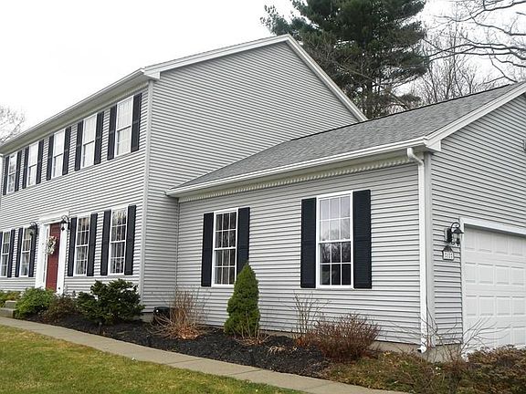 Wonderful, well maintained 8Room, 4BR, 2.5Bath Colonial home on a private cul-de-sac. Freshly painted in current color palette, this one is move-in ready! Kitchen boasts a center island with seating, good work area & cabinet space, new 'stainless' steel appliances, & large dining area is open to the family room w/brick fireplace. Sliders open to a large rear deck facing the woods. Formal dining room, half bath, and front LR or office complete the main level. Upstairs are 4 Bedrooms and a hallway full bath with tub/shower. The master suite has a tray ceiling, 2 closets and a private shower bath, with granite vanity sink and ceramic tile floor. Carpets have been freshly shampooed. The lower level offers a finished rec room w/carpet/ bead board wainscot walls. There is also a second play room or media/exercise room and the laundry is located next to a room that could be an office/shop/craft room. You will love this cleverly designed custom home.