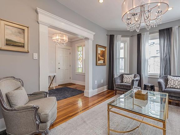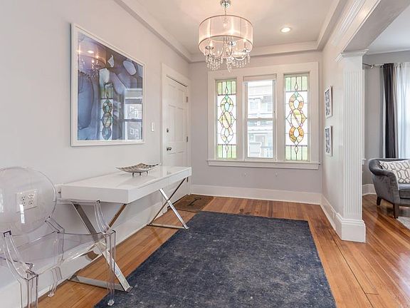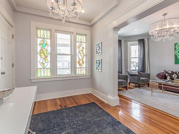Classic Dorchester triple decker with nice architectural details, stained glass windows and fluted columns. This unit has been beautifully updated with an open floor plan kitchen, quartz counter tops and Fischer Paykel appliances. Bathroom is redone with glass vessel sink and carerra marble tile. Central air, pantry with washer/dryer, deeded storage in the basement, front and back porches.