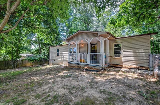 Affordable well kept home just outside Avl city limits! Fully fenced level yard with onsite parking, permanent foundation compliant with FHA guidelines when bought, many updates: furnace/central air in 2004, new roof 2004, 2006 fencing, recent paint/flooring, etc. Shaded lot with mature trees, split bedroom floor plan with walk-in closets in all bedrooms, master bath has double vanity sinks, living room has brick fireplace, cvd.front and rear porches, MOVE-IN Ready, less than 10 mins to AVL!