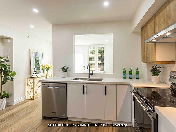 Stylish kitchenQuartz countertopsModern backsplashStainless steel appliancesPot lightsSmooth ceilingsTwo spacious bedrooms