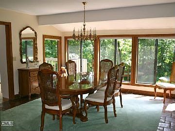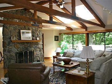 Quality stone and cedar contemporary with open floor plan by Frank Lloyd Wright inspired local architect Roger Carpenter. Beautifully sited on bucolic private cul-de-sac yet very close to Historic Ridgefield Center. Open floor plan, massive stone fireplaces,beams, soaring ceilings, great room. Oversized multiple decks. Two plus acres. In this 'new' COVID era, in additional to your traditional living areas this home satisfies all your needs with generous options for home office and school learning spaces for the entire family. A very special home!