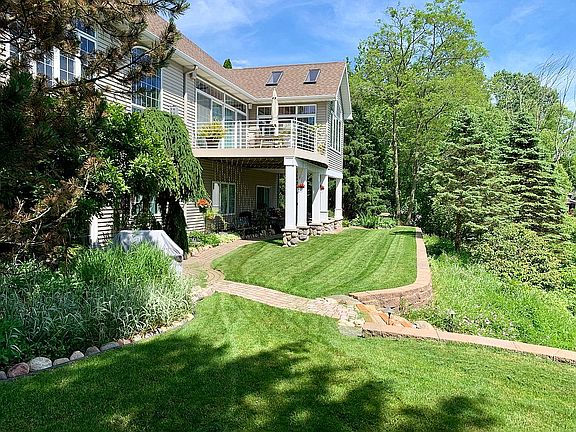 Spectacular custom home with surrounding landscaped berms of planted perennial beauty and a walk-out level bricked pathway leading to dock and 139 ft. of frontage on a lake where there is no worries about lake level. Enjoy breathtaking, panoramic lake views from all rooms. Exceptional fishing, kayaking, and ski/tubing from your lakefront home. Community provides a private sandy beach and swim area with a raft, playground, and sports courts for both children and adults. Dining Room with 18 ft. cathedral ceiling, Kitchen boasts walk-in pantry, granite six-person bar and a granite Butler Bar with cabinets and a wall-mounted TV. Main floor open concept includes Great Room with gas fireplace and indoor/outdoor sound system. Double sliders to the deck . Exceptional four-season room with separate slider deck access. Main floor Master Suite overlooks the lake and boasts a walk-in Closet and En Suite with shower and double-Jacuzzi tub. Main floor laundry. Three-stalled, attached Garage and mudroom. Lower level walkout to the lake includes 9 ft. ceilings, 2nd Full Kitchen, Rec Room, surround sound entertainment, slider to bricked patio with gas grill piped to the home's natural gas. Two huge lower level Bedrooms with walk-in closets, plus a Bonus Room with built-in desk and cabinets. Full lower level Bathroom. Roof fully replaced in 2015, extended guarantee transferable. Lake Doster Golf Club, and Lake Doster Tennis Club memberships are available. An abundance of nature frequent lowlands: deer, eagles, swans, herons, hawks, ducks, and other wildlife. Welcome to tour!... bring pre-approval letter. Buyers agent 2.5% commission offered.