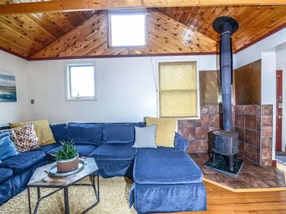 Darling Beach Bungalow with open living spaces, cathedral ceilings, natural wood textures, yacht like details and a story book back yard with circular slate patio. It's the perfect summer getaway so close to the beaches and restaurants or perfect winter retreat with a wood cabin feel complete with Lange Wood Stove to enjoy a crackling toasty fire. Surprising space with plenty of room for entertaining, 2 bedrooms and 2 living spaces. Jump in the outdoor shower after a day at the beach then enjoy dinner and sunset on the redwood deck.