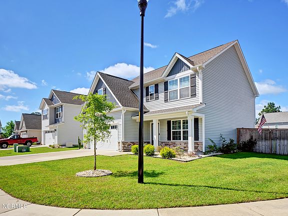 Relax at the end of the day on the covered back porch or BBQing with friends in the privacy of the fenced backyard with additional storage in the shed. Cozy front porch if perfect for visiting with the community. Stone accents and gables give a beautiful elevation to this home. The community was designed for the active lifestyle, with sidewalks, plenty of ponds, picnic spots, nature areas and pool. Minutes to Topsail Island beaches and a short commute to Jacksonville, Wrightsville Beach, downtown Wilmington, restaurants/shopping in Porters Neck and Mayfaire. It's all about location and this one is perfect