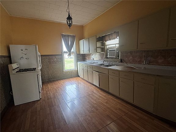 The potential is here....Vinyl-sided home with a covered side porch and a 2-car detached garage on a nice-sized lot. Kitchen has quite a few cabinets and a range and refrigerator that stay, although condition unknown and not warranted. Living and dining rooms appear to have newer laminate floors and living room has an electric fireplace included as well. 2 bedrooms, bathroom with walk-in shower and a large laundry room in addition to a separate utility room. Located just a block off the main route thru Ashmore, this would make a great fixer upper or rental ? SELLING AS IS with no warranties