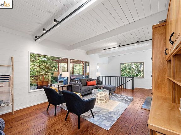 It's the simplest way to invite comparison to the coolest of retreats -- combine Mid Century Eichler-style with a treehouse setting and, voila -- 12 Echo Lane appears in the hills of Piedmont. Nestled amidst redwood trees at the end of a private cul-de-sac the location offers secluded serenity, yet is moments away from Moraga Avenue and convenient access to schools, parks, shopping districts and commute options. The strong indoor-outdoor focus of the home is easy to see as you enter through a new three-panel glass door. Built around an expansive interior garden courtyard, the rooms open up to light and greenery wherever possible. Recently updated, the three bedroom, two bath house lives large, in part due to the many windows that visually connect the interior with the outside. With white shiplap walls and and high beamed ceilings, the vacation vibe of the living room cannot be denied, and the expansive deck surrounded by redwood and oak trees acts as a natural extension of the home.