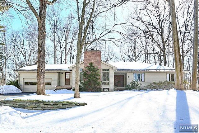 Spacious and bright Mid century modern ranch on gorgeous level lot, terrific setting and curb appeal in lovely Woodcliff Lake neighborhood. Enter thru the large entry foyer that opens into living room where you can get a view of this beautiful level lot and setting. Master bedroom was once 2 bedrooms so its large with great closets and large master bath. The family room has a floor to ceiling stone fireplace and vaulted ceilings and wide plank floors. 2 car garage just off mudroom and kitchen. Laundry on 1st floor. The lower level has a home office or guest room with an attached bathroom that is not currently functioning (shower faucet requires replacement and toilet being worked on). The homes has 3 bedrms and 2.5 baths on main level - potential for 3rd full bath in basement... Make this lovely home your dream home!