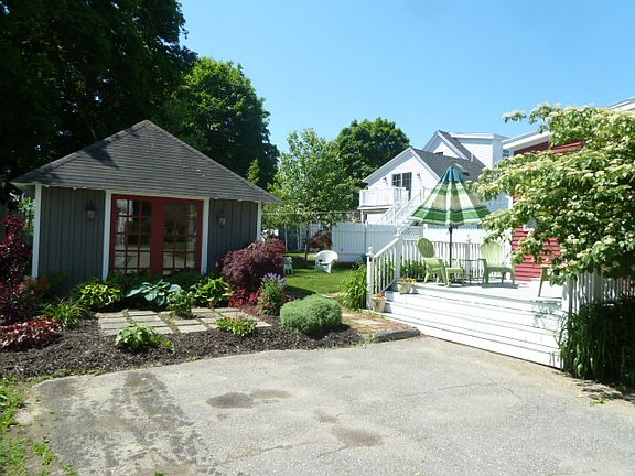 Newly up-dated with additional full bath & laundry on second floor & kitchen updates - charming & architecturally unique in-town cape featuring first floor BR, hard wood floors, restored original tin ceilings, all new windows, large east-facing deck, separate insulated studio/guest house, mature landscaping and gardens, Truly move-in ready. Close to harbor and downtown, yet located in quiet neighborhood.