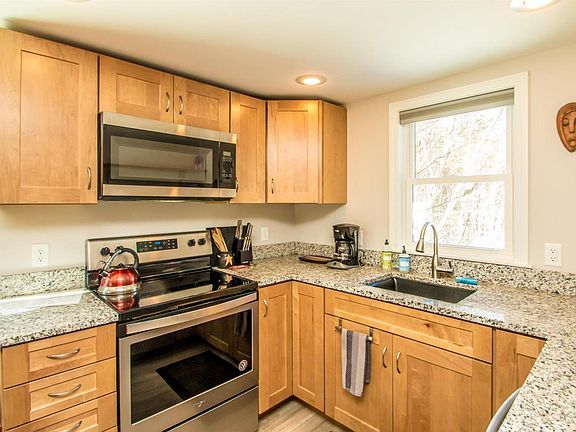 Completely renovated 2 bedroom, 2 full bathroom end unit with Roxul sound barrier insulation close to Cathedral Ledge. Mountain views close to Attitash, Cranmore and less than 2 miles from downtown shops and dining. Open concept kitchen/dining and living room with lots of natural light in this cozy home.