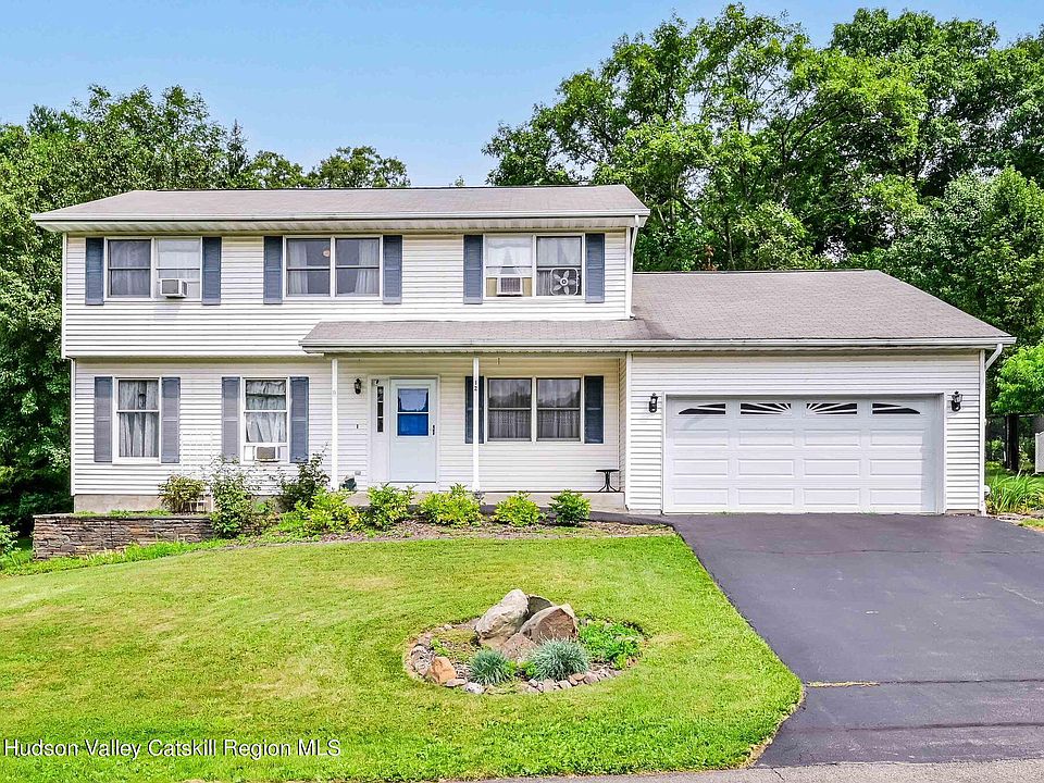 Extra! Extra! Read all about it! Comfortable living at its best in this well-maintained colonial. On a quiet street in the desirable Village of Port Ewen. Close to all the action in the vibrant City of Kingston for shopping, dining, and great coffee shops. Six minutes from the Rondout Waterfront. This home is perfectly situated to much of what makes this area special. The peaceful Heavenly Valley Subdivision leads you to this four-bedroom, two-and-a-half-bathroom 1985 Colonial — 2,240 square feet of living space plus a fully finished basement. Hundreds of daffodils bloom in spring and the stunning perennial garden is a 35-year labor of love and it includes a mature fig tree. Perfect for entertaining your guests because two sets of sliding glass doors will lead you to a large rear deck, partially covered by an awning that makes for great relaxation, meals, and entertainment while watching the deer, foxes, rabbits, and turkeys. Pick some lettuce, cucumbers, green beans, and tomatoes from the kitchen garden — rinse them off at the outside spigot and there is your summer salad!