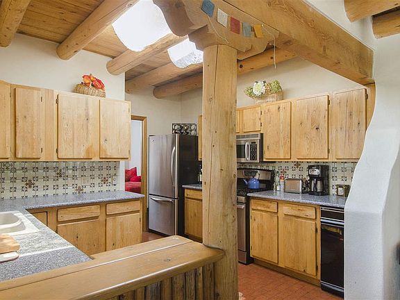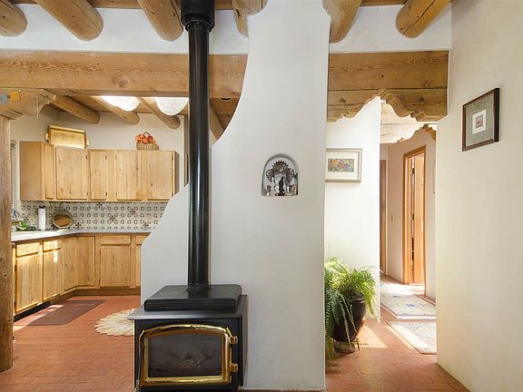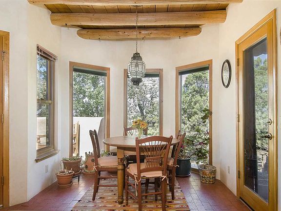 Set back from the road nestled in the trees with mountain views peeking through the greenery sits this private retreat. Brimming with "old world" charm, brick floors and viga beams throughout this passive solar design was built by RJ McMillan. South facing long windows, skylights, backed up by gas heating stove centrally located provides for cozy warm winters. Surrounding trees help add to the swamp cooler for summer comfort. The open plan living room, dining and kitchen, Santa Fe style corbelled beams & adobe stepdown wall with nicho. French doors lead to study/bedroom and there is a 3rd office/guest bedroom. The large master bedroom has plenty of closet space and a wonderful "woodsy "feel. There are solid oak cabinets and silestone countertops in the kitchen plus all appliances stay. An oversized garage includes a new garage door & opener plus a new hot water heater and the east sash windows all new in 2011. Lovely native landscaping, private portal and yes don't forget the fenced organic veggie garden!