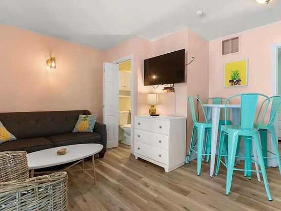 Now accepting 30+ night stays starting Nov 1st-April 30th. Welcome to the "Pineapple Retreat", centrally located in the Colonial Seaside Condominiums, on G Street, just steps to the beach, boardwalk & top attractions. This stylish condo sleeps up to 4 people in 1 queen bed and 1 full-sized sleeper sofa, there is 1 bathroom, 1 covered parking spot, 2 TVs and a fully-stocked kitchen. You're a 1/2 block from the beach, boardwalk, arcades, Casino Ballroom, children's playground, restaurants, bars & shops. The space KEY FEATURES Steps to the beach, boardwalk & top attractions Small balcony 352 sqft seaside getaway Common outdoor balcony Plenty of natural light Fully furnished vacation rental AC and heat available One complimentary covered onsite parking spot BEDROOM Queen bed Smart TV with the ability to login to streaming platforms Clean linens FULLY EQUIPPED KITCHEN Full-sized sleeper sofa with clean linens provided Smart TV with ability to login to personal streaming platforms Fully equipped kitchen with updated appliances Coffee and coffee maker provided. Fully-stocked kitchen. Access to common balcony BATHROOM Full bathroom with standing shower Clean towels provided LAUNDRY Coin-operated laundry room for all guests *Available for 30 day or more rental November 1st 2025 - April 30th 2026 * The owner pays all utilities. * Booking includes and is protected by our damage protection program (fee is $50/stay) * Cleaning is required monthly, and inspections happen randomly at our discretion with 24 hours' notice. * No smoking, vaping or illegal drugs in or on property. Smoking is NOT allowed inside the house or on the deck or within the building. * We collect the first and last month's rent once the reservation is confirmed for 60 days or more. * We ask all guests, upon confirmation of their reservation, to complete the Guest Information form and acknowledge the Short Rental Agreement. These requirements are important for the smooth operation of our property and to ensure a pleasant stay for all guests.