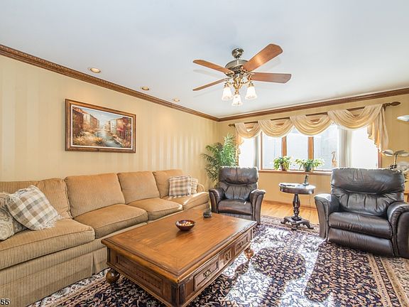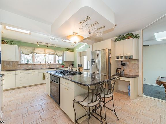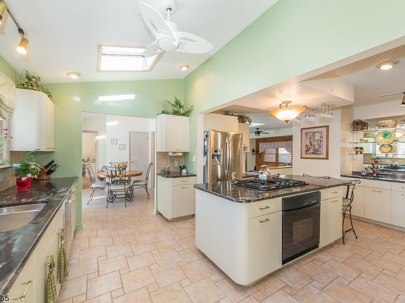 Fantastic open floor plan - great for entertaining! Large kitchen w/granite counter tops, c/t floor, center island w/gas stove, s/s refrigerator, vaulted ceiling w/skylight, separate breakfast room& rec eyeball lighting. The formal Dining Room has h/w floors, beautiful vaulted wood ceiling w/skylight & transom topped sliders leading to large deck w/natural gas line for grill plus outdoor speakers. Spacious LR has h/w floors, crown molding, rec lighting & large bow window. Huge Master bedroom has vaulted ceiling, sliders to deck, rec lighting plus spacious Master Bath w/Jacuzzi tub & stall shower, vaulted ceiling & skylight. FR w/skylight off kitchen, large storage shed, beautiful landscaping w/sprinkler system, multi-zone heating & air. A must see!