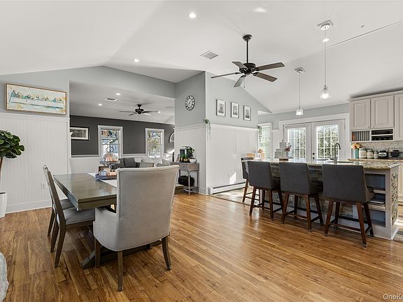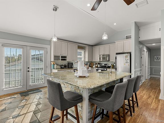 Charming updated Ranch South of Montauk! Move right into this beautifully maintained 3 bedroom 1.5 bath ranch offering an open floor plan and elegant details throughout! Featuring stunning hardwood floors, custom moldings, and vaulted ceilings, this home combines classic charm with modern comfort. The updated kitchen boasts granite counters, stainless steel appliances, perfect for entertaining and every day living. Enjoy year round comfort with natural gas heat with both energy efficient heat pump and baseboard heating as well as central air. Exterior highlights include Hardy Plank siding, new windows, a blue slate front porch, wood deck, and paver patio. Located close to Tanner Park enjoy outdoor concerts in the summer, beaches and local amenities. This home offers the perfect blend of coastal living and convenience! Low Taxes $11,484 before basic star rebate. This is the one you have been waiting for!~