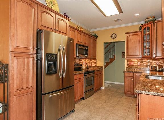 Many extras in handsome 7 room/3 bdrm/2.5 bath, 2377SF Townhouse Condo unit at Eastwoods. Open floor plan contemporary feeling w/ versatile living area features 1st floor MBR suite w/full bath & walk-in closet, Dine-in kitchen offers generous cabinet storage, extra lighting, granite counters & glass tile backsplash, LR/DR combination great room w/Gas Fplace/marble surround/wood mantle leads to lovely sunroom w/cathedral ceiling & sliding doors to deck & step down 13x12 paver patio. A mechanical awning extends to the railings of the deck, and manual roll down screens create a wind break for a gazebo screened porch effect. Front guest bedroom on the first floor used now as a sitting room/den. Main level laundry/pantry closet too. Upper level features an open landing office space with palladium window, a bedroom with 2 double closets, full tub/shower bath, and a study w/ skylight window. Over 55 campus allows 2 small pets per unit. Located near shopping & highway access