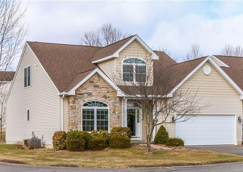 Many extras in handsome 7 room/3 bdrm/2.5 bath, 2377SF Townhouse Condo unit at Eastwoods. Open floor plan contemporary feeling w/ versatile living area features 1st floor MBR suite w/full bath & walk-in closet, Dine-in kitchen offers generous cabinet storage, extra lighting, granite counters & glass tile backsplash, LR/DR combination great room w/Gas Fplace/marble surround/wood mantle leads to lovely sunroom w/cathedral ceiling & sliding doors to deck & step down 13x12 paver patio. A mechanical awning extends to the railings of the deck, and manual roll down screens create a wind break for a gazebo screened porch effect. Front guest bedroom on the first floor used now as a sitting room/den. Main level laundry/pantry closet too. Upper level features an open landing office space with palladium window, a bedroom with 2 double closets, full tub/shower bath, and a study w/ skylight window. Over 55 campus allows 2 small pets per unit. Located near shopping & highway access